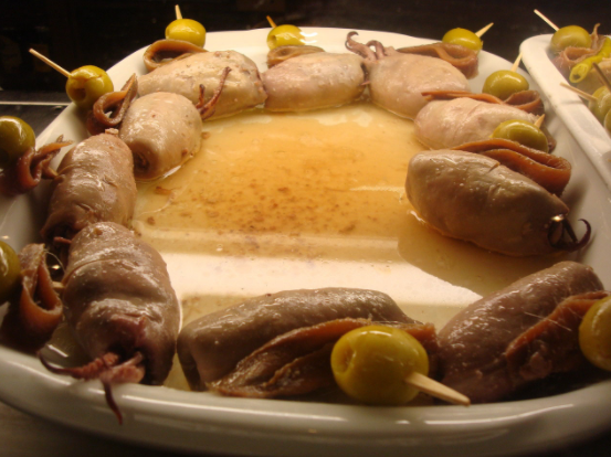 Chipirón con anchoa y oliva.